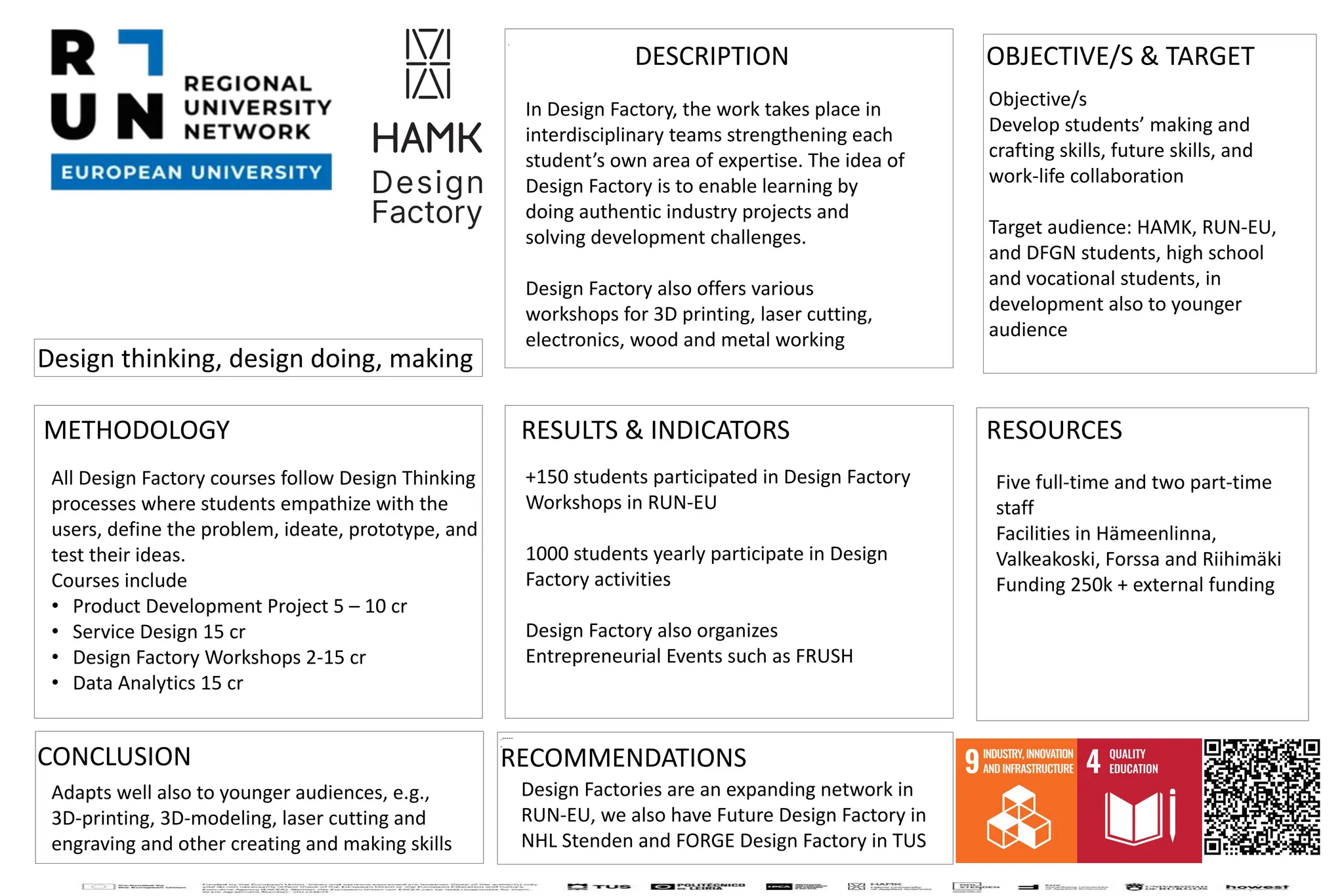The document describes Design Factory, which aims to develop students' making, crafting, future, and collaboration skills through interdisciplinary project-based learning. Students work in teams on industry projects and challenges, following a design thinking process. Over 150 students participate in workshops on topics like 3D printing, laser cutting, and electronics. Design Factory also organizes entrepreneurial events and has five full-time staff and facilities across multiple locations, serving over 1,000 students annually. It concludes that Design Factories are an expanding network that can also engage younger audiences in skills like 3D modeling and making.
