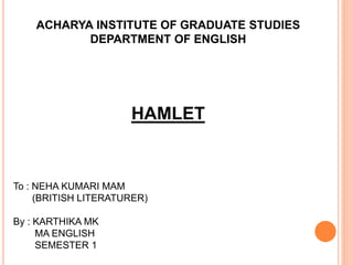 William Shakespeare wrote the famous tragedy Hamlet between 1601-1602. It is set in Elsinore Castle in Denmark and follows Prince Hamlet's quest to avenge his father's murder by his uncle Claudius. The play explores themes of revenge, morality, and the difficulty of action versus thought. Hamlet struggles to act on his mission due to his introspective nature. He devises a play to prove Claudius' guilt but delays confronting the king directly. This inaction leads to escalating chaos and tragedy for Hamlet and many other characters.
