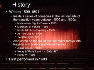 The document provides a summary of William Shakespeare's play Hamlet. It was written around 1599-1601 and was influenced by earlier versions of the story as well as Shakespeare's other works. The play is set in Denmark and follows Prince Hamlet who seeks revenge against his uncle Claudius for murdering Hamlet's father and marrying his mother. It explores themes of familial duty, the struggle between action and inaction, sanity, and uses the human body as a metaphor for the state of Denmark. The play had a lasting legacy and introduced iconic characters and quotes that are still referenced today.