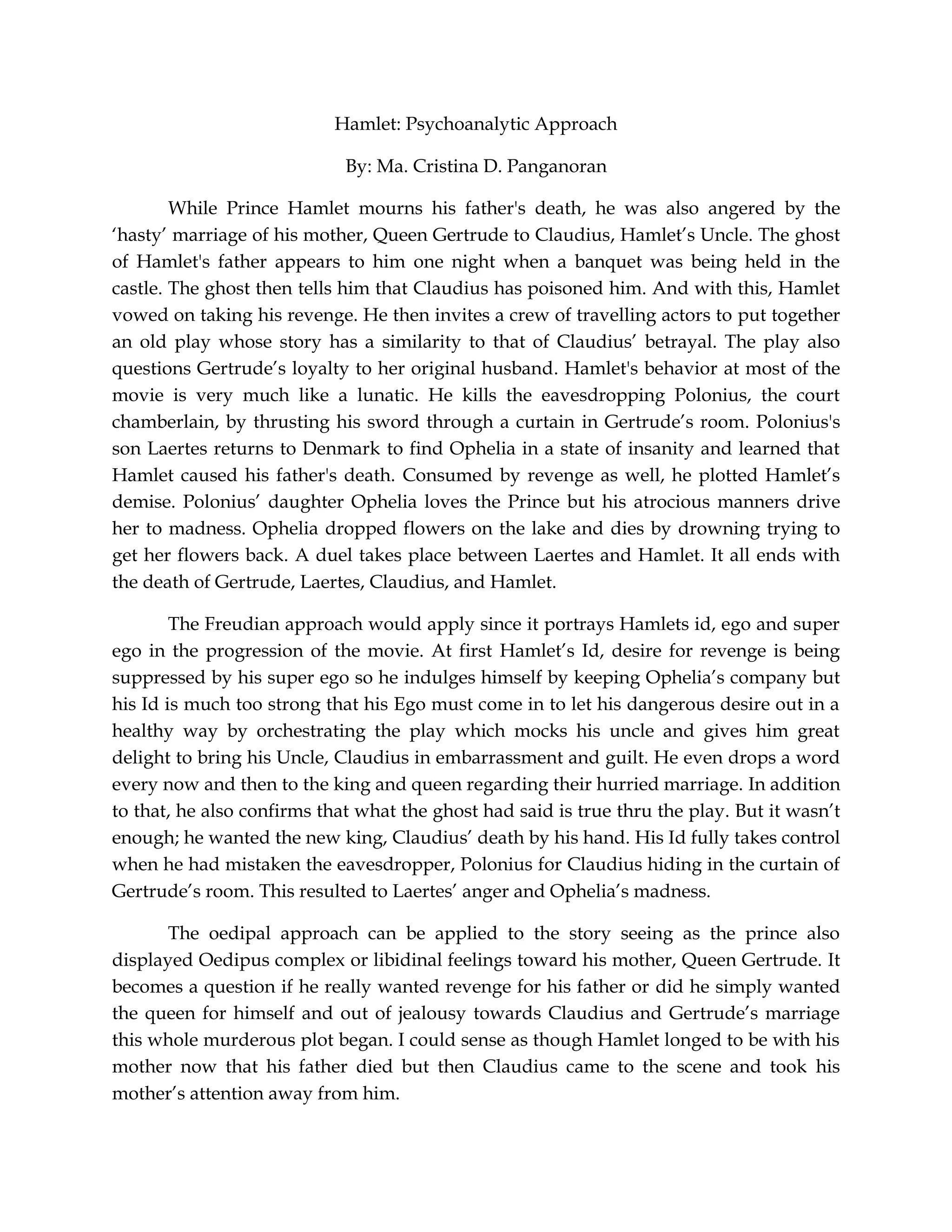1) The document analyzes William Shakespeare's play Hamlet from a psychoanalytic perspective, specifically exploring Freudian and Oedipal complexes within Hamlet's character.