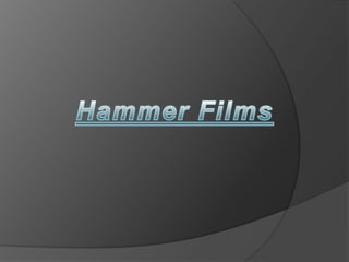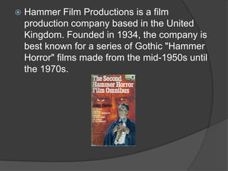 Hammer Film Productions is a UK-based film company founded in 1934 known for its Gothic "Hammer Horror" films from the 1950s-1970s which dominated the horror genre. They found success through partnerships with major US studios that gave their low-budget but suspenseful films featuring Frankenstein and Dracula sequels worldwide distribution. The document seeks inspiration from Hammer Films' ability to satisfy horror audiences on a small budget through simple yet effective use of props and effects to create thrills.