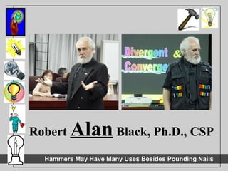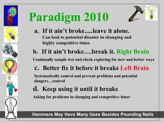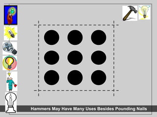 The document provides an overview of creative thinking tools and techniques that can be used to maximize creative skill development. It discusses warm-up exercises to open thinking, as well as divergent thinking tools like brainstorming, forced relationships, idea grids, and morphological grids. Convergent thinking tools are also presented, such as SCAMPER, checklisting, value grids, and PCP analysis for evaluating ideas. The goal is to learn, use, and create with these different creative thinking tools.