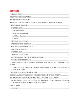 The document discusses the hammerhead ribozyme (HHR), a catalytic RNA, highlighting its discovery, structure, and enzymatic properties. It reviews its significance in RNA catalysis and gene regulation, detailing various studies on its mechanics and efficiency compared to protein enzymes. The document serves as a comprehensive overview of HHR's role in biological contexts and its potential applications in biotechnology.