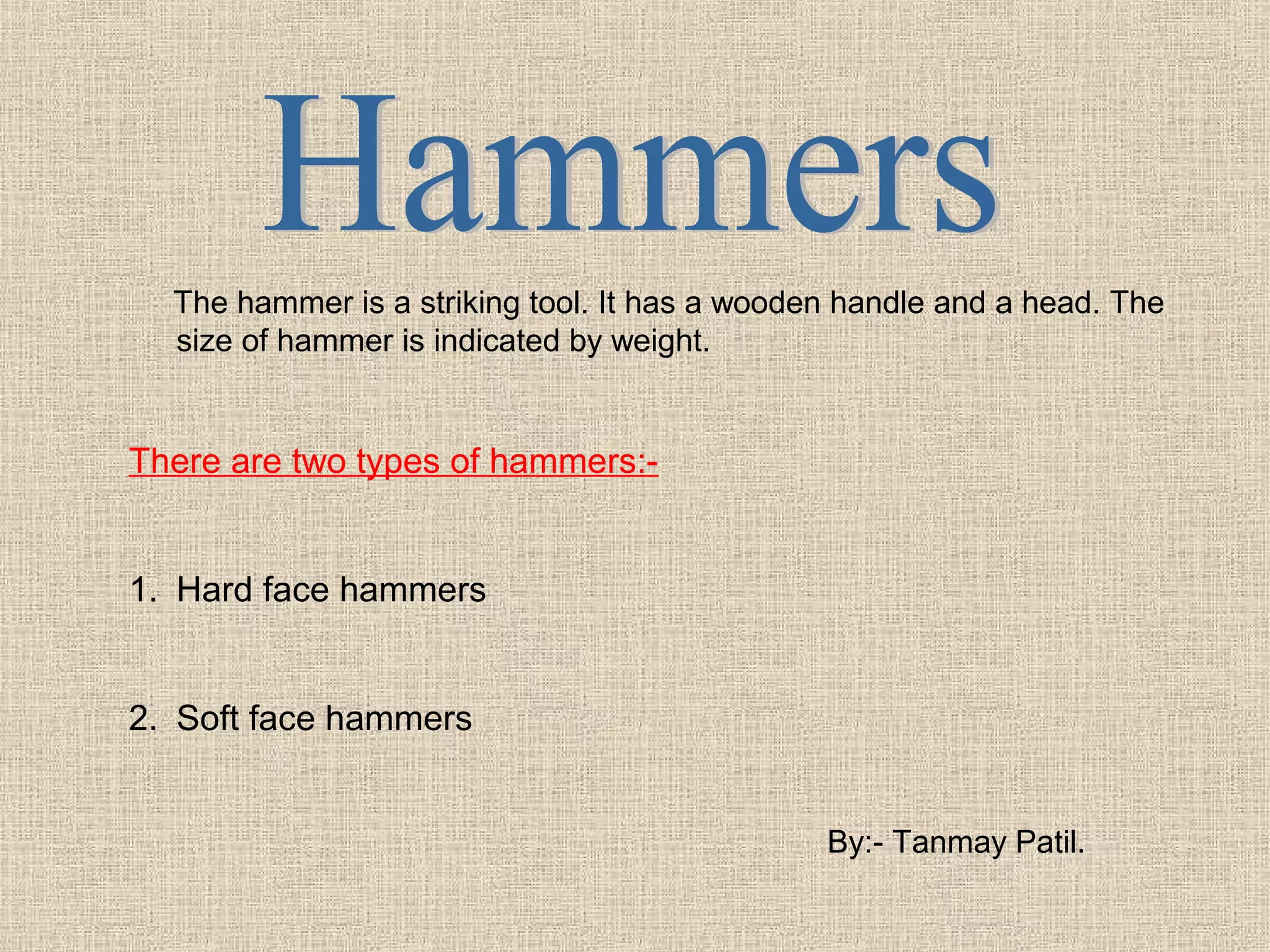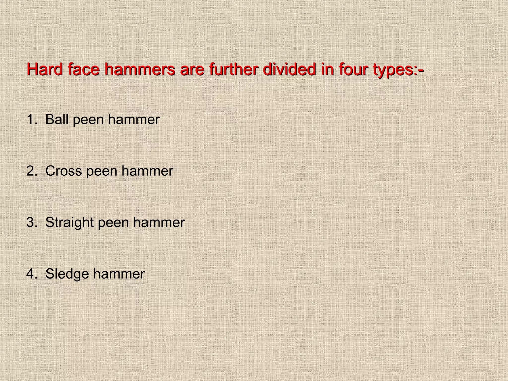 The document discusses different types of hammers. There are two main types: hard face hammers and soft face hammers. Hard face hammers include ball peen hammers, cross peen hammers, straight peen hammers, and sledge hammers. Ball peen hammers have a ball-shaped peen and are used for general purposes. Cross peen hammers have a wedge-shaped peen perpendicular to the handle and are used for heavy work. Straight peen hammers have a peen parallel to the handle and are used for swaging and riveting. Sledge hammers are the largest and heaviest hammers, used