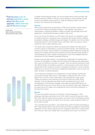 The London Borough of Hammersmith and Fulham council implemented a desktop virtualization solution using Cisco technology to address budget challenges, enable greater flexible and mobile working, and improve security. The new VDI platform hosted in two data centers has led to a 20-25% reduction in cost per user, 80% lower power consumption, and a one-third reduction in total cost of ownership. It has also accelerated the shift to mobile working from 50% to 85% of employees.