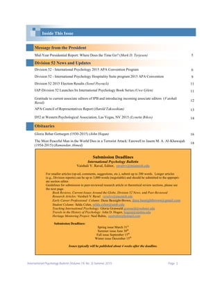 This document is the Summer 2015 issue of the International Psychology Bulletin, which is published by Division 52 (International Psychology) of the American Psychological Association. It contains the following sections: