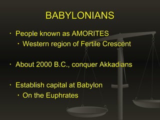 The Babylonian Empire was established around 2000 BC after the Amorites conquered the Akkadians and established their capital in Babylon on the Euphrates River. King Hammurabi ruled from 1792-1750 BC and expanded the empire throughout Mesopotamia and the Fertile Crescent by installing governors and judges to maintain order. Hammurabi collected and standardized existing laws into the first formal legal code, which was inscribed on stone pillars erected in major cities to ensure all citizens knew the laws and punishments. The Code of Hammurabi established principles of legal precedence and retaliation proportional to social status or crime.