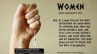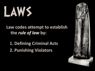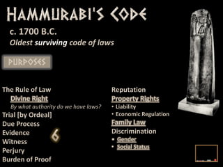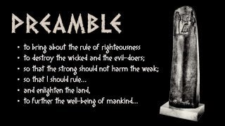 Hammurabi's Code is the oldest surviving code of laws from the ancient world. This PowerPoint presentation is designed to introduce World History students to Hammurabi's Code and to explain how the law code typifies laws from the ancient world. Hammurabi's Code is also compared with modern law codes, such as the United States Constitution. For more instructional resources, visit www.tomrichey.net!