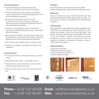 The Anosecure FD30 is an apartment entrance doorset developed by Hanson and Beards Ltd to meet performance demands. It has heavy-duty construction, fire and sound resistant properties to meet various building regulations. The doorset comes with a high quality espagnolette lock and hinges, and is available in different finishes and sizes up to 2100mm high and 1050mm wide. It is supplied pre-assembled for easy installation.