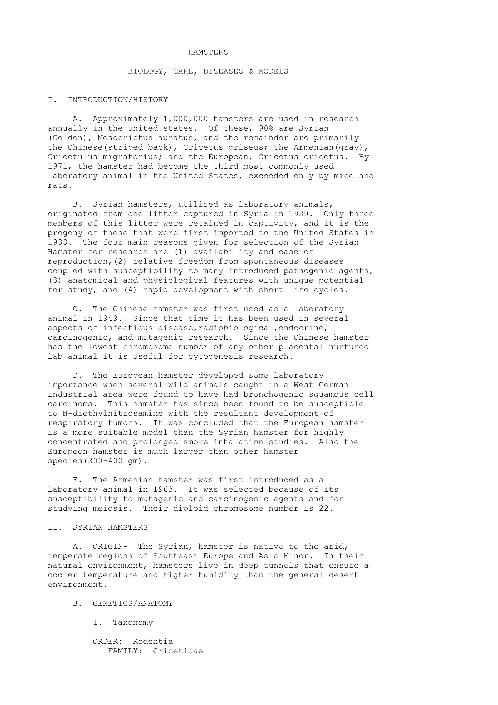Hamsters are commonly used small laboratory animals. The Syrian golden hamster is the most frequently used species, comprising 90% of hamsters in research. They are easily bred and reproduce rapidly, with females having 4-12 pups after a 15-18 day gestation. Hamsters are nocturnal and hibernate in temperatures below 50C. Proper housing includes plastic cages with bedding such as wood chips or sawdust.
