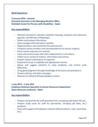 Hanadi Ali is a Palestinian national who has over 15 years of experience working in administrative roles in Qatar. She has a bachelor's degree in hospital administration and holds several certifications. Her career has included roles as an executive secretary, employee relations specialist, and visitor services coordinator. She is skilled in communication, organization, and customer service.