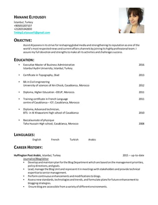 This document is a resume for Hanane Elyousefi. It summarizes her objective of assisting Al Jazeera in strengthening its reputation as a respected global news channel. It then lists her education history which includes degrees from universities in Morocco and Turkey. Her career history includes positions as a journalist, researcher, and business development consultant. She is multilingual and has published over 20,000 blogs and articles. Her skills include project management, communication, marketing, and media production.