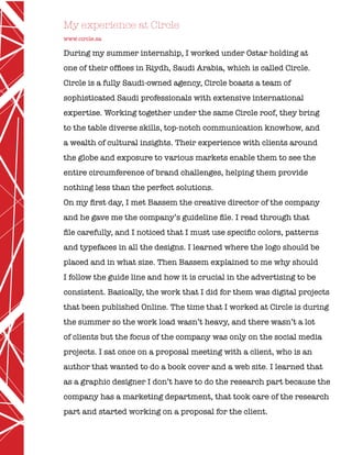 Hanan Alshawi completed a summer internship at Circle, a graphic design agency in Saudi Arabia. She learned about following brand guidelines and worked on several social media projects, including infographics about selfies, mosques, and preparing for Ramadan. She attended meetings to discuss campaign ideas and learned about different aspects of branding projects. While the internship provided valuable experience, Hanan felt her creativity was sometimes limited by the need to follow Circle's style guidelines.