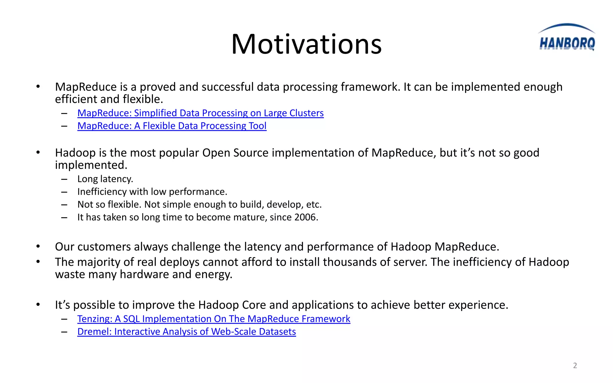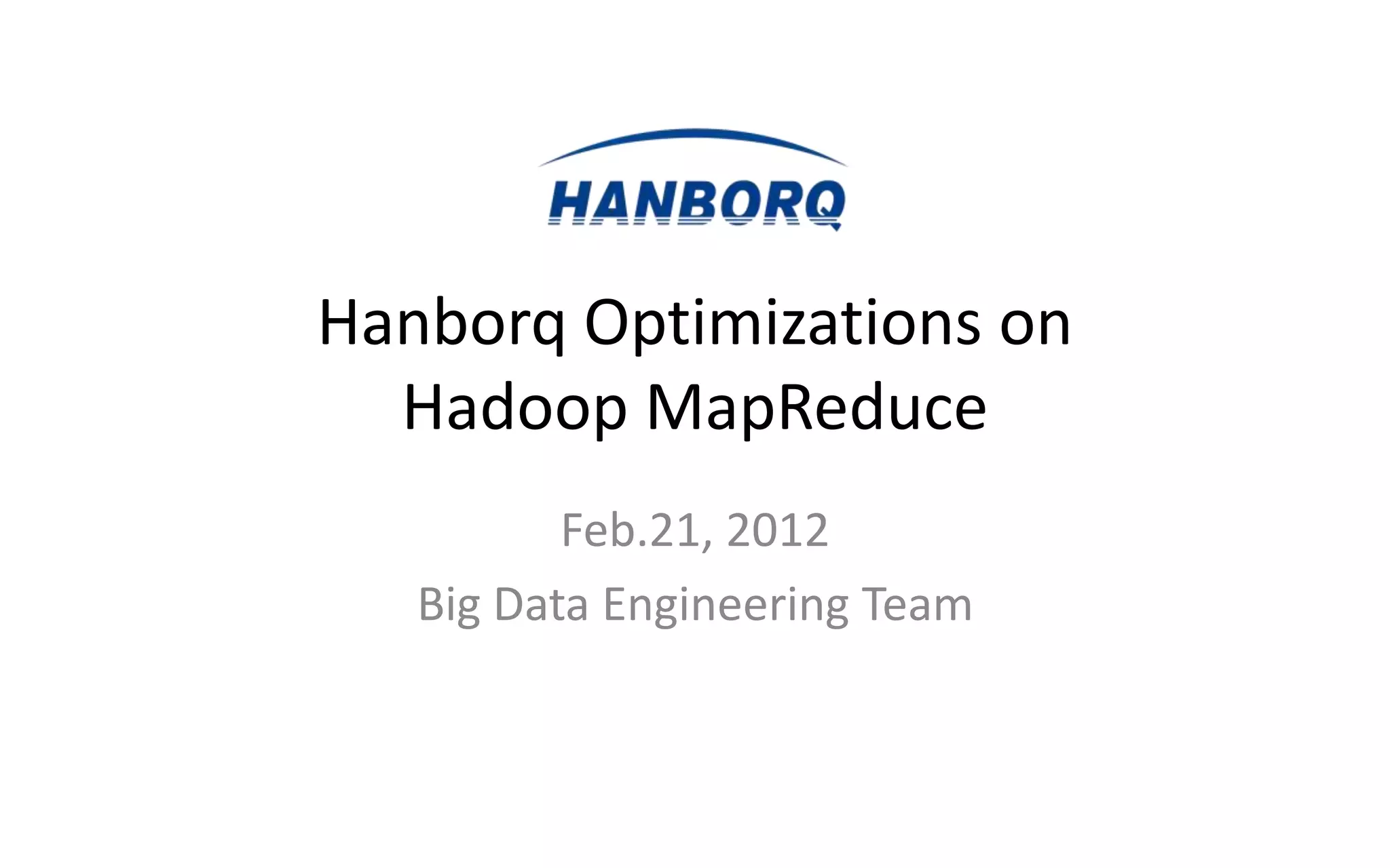 The document discusses optimizations for the Hadoop MapReduce framework, focusing on improving latency and performance by implementing features like a worker pool and efficient data transfer methods. It highlights the benefits of tuning configurations and making architectural changes to enhance data processing efficiency. The proposed 'hanborq distribution' aims to deliver a faster, simpler, and more robust version of Hadoop, particularly beneficial for enterprises struggling with MapReduce performance.