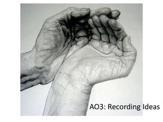 The document outlines success criteria for drawing hands with different grade levels. An A*-B grade requires an observational drawing of hands with accurate proportions, high-level detail, control, and tonal shading. A C-D grade needs hands drawn from an image sheet with accurate proportions and some tonal shading and detail. An E-F grade is a simple hand drawing from a step-by-step guide that lacks accuracy, proportion, detail, and has untidy tonal shading.