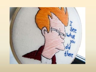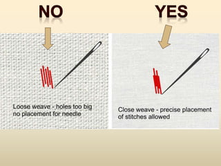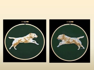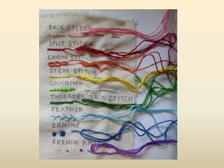 Embroidery is the craft of decorating fabric with thread or yarn using a needle. It has a long history dating back 30,000 years, with early examples found in Russia and China. Various stitches were used throughout history to create embroidery designs. Modern embroidery still uses traditional materials like thread, needles, and fabric, though machines and computer software have made the process easier. This document provides instructions for a class on hand embroidery, including recommended stitches to try like running stitch, backstitch, and French knot. Students are encouraged to design their own 4x4 inch patches and experiment with color mixing in their embroidery designs.