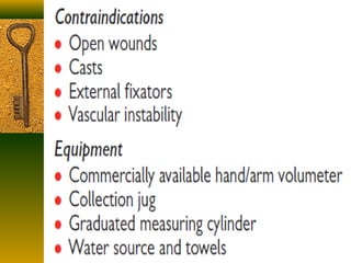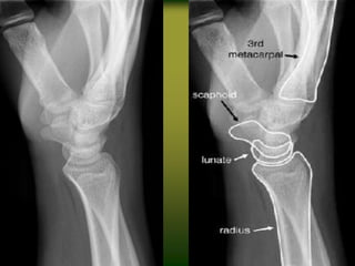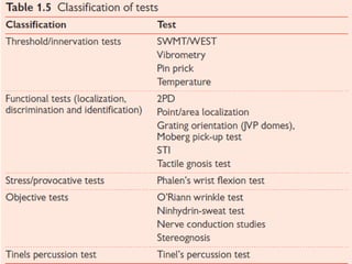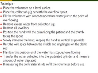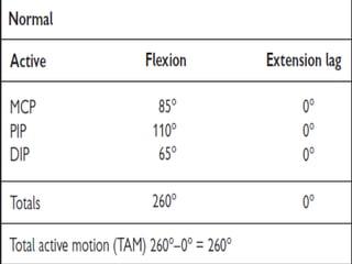 This document provides an overview of how to evaluate the hand. It discusses the anatomy of the hand including bones, muscles, nerves and arteries. It describes taking a patient history and examining the hand for range of motion, deformities, palpation, observation, and functional assessment including grip strength and pinch tests. It also discusses evaluating the hand for conditions like edema and outlines tools used for various assessments.