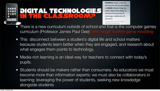 This document discusses using new digital technologies in the classroom. It notes that students are engaged with technology outside of school but it is rarely used within classrooms. It promotes using mobile devices like iPods to access educational apps and content. The document encourages teachers to explore using iPods and their educational apps to engage students and connect with their digital lives. It provides examples of useful education apps and resources available.