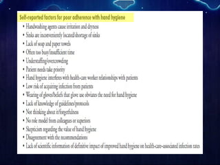 This document discusses the importance of proper hand hygiene for healthcare workers. It explains that hands can transfer pathogens between patients through the resident and transient bacteria on the skin. Failure to properly cleanse hands between patients or during patient care can lead to cross-contamination and healthcare-associated infections. The document provides guidance on when handwashing and hand antisepsis is required, such as before and after patient contact, after using the restroom, or if hands are visibly soiled. It also describes proper handwashing technique and highlights frequently missed areas that require special attention during cleansing.