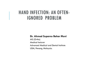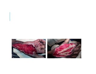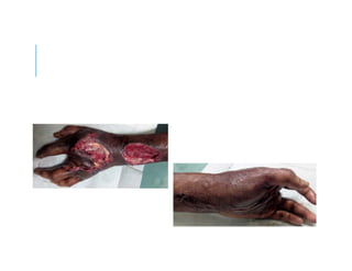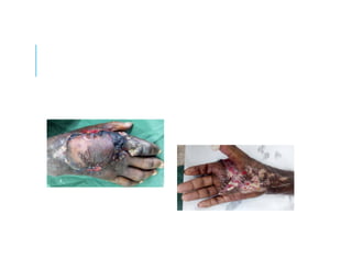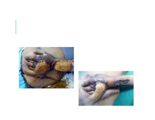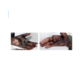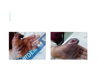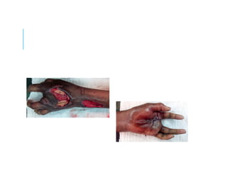This document discusses a case study of hand infections in diabetic patients. 49 diabetic patients with hand infections were examined. The majority had deep infections involving bone or joints. Many required multiple surgeries and amputations. Poor glucose control and insulin dependence were associated with worse outcomes. Aggressive surgical debridement and antibiotic treatment are needed to manage these infections, which often have severe consequences if not properly treated.