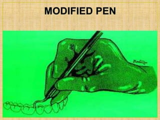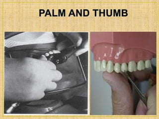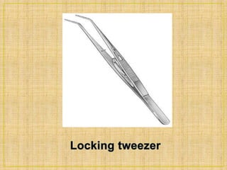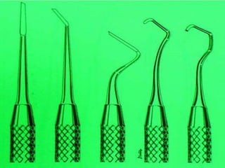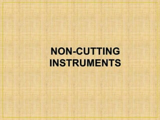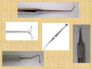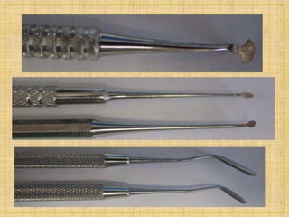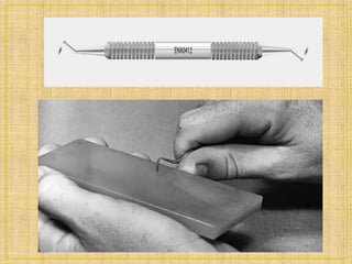 The document provides a comprehensive overview of dental instruments used in dentistry, categorizing them into cutting, non-cutting, diagnostic, plastic, and amalgam instruments. It details the materials used (carbon steel and stainless steel), the design, parts, and types of each instrument, as well as their functions and specific uses in dental procedures. Additionally, it explains the instrumentation nomenclature, including formulas for hand cutting tools based on dimensions and angles.