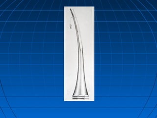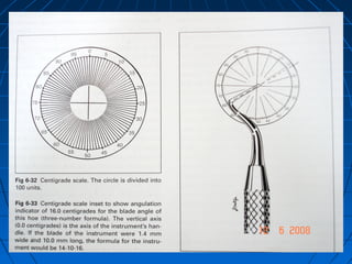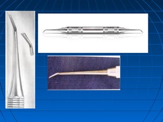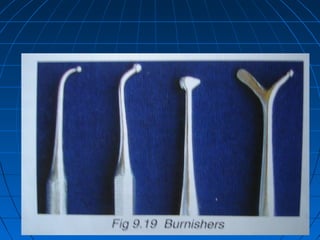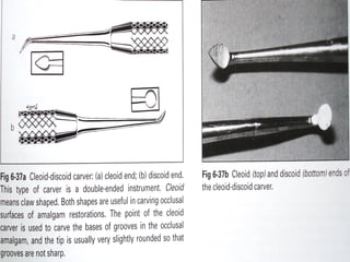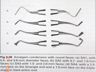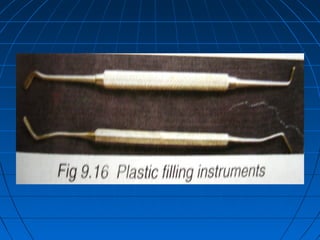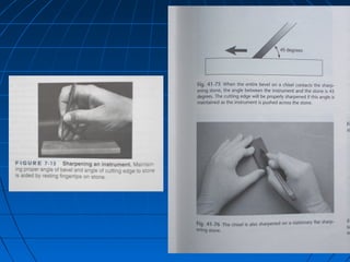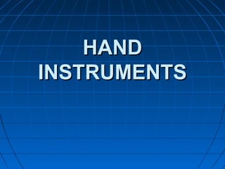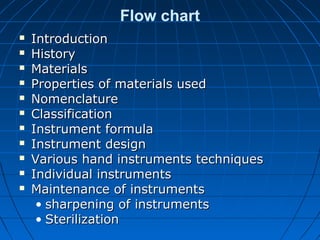 Hand instruments are essential tools for restorative dentistry. They are made from materials like stainless steel, carbon steel, and carbide to provide durability and sharp cutting edges. Instruments are classified based on their purpose, such as cutting or condensing, and their design features such as blade width, length, and angles. Proper instrument design concentrates force on the thin cutting edge. Instruments are also designed to balance within 3mm of the handle for control during use. Right and left versions are produced based on blade bevel orientation or curve. Hand instruments require maintenance like sharpening and sterilization to function effectively.