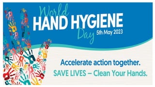 This document provides information on proper hand hygiene and hand washing techniques. It defines hand hygiene and different types of hand washing. The five main indications for hand hygiene according to the WHO are outlined. Proper hand washing procedure involves 15-30 seconds of lathering and washing hands using friction between fingers and thumbs, followed by thorough rinsing and drying with paper towels from clean to less clean areas. Maintaining short nails and avoiding jewelry helps remove microorganisms and prevent their spread when washing hands.