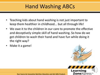 This document promotes a hand washing poster called "Hand Washing ABCs" that teaches children the proper four steps of hand washing while singing the ABC song. The poster is intended for preschool through kindergarten ages and encourages effective hand washing in a fun way. It is laminated and costs $7.95 to purchase individually or through their website.