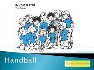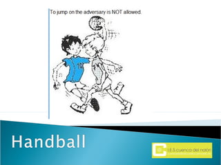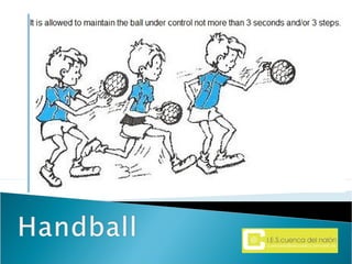 Handball is a team sport played by two teams of seven players each on a rectangular indoor court. The objective is to throw the ball into the opposing team's goal using any part of the body above the knee. Players advance the ball by running or throwing it to teammates but are not allowed to walk or run with the ball.