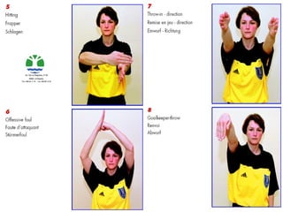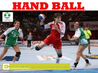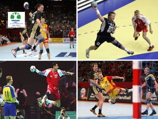 Handball is a sport played on a court with goal posts at each end; the court includes a goal area and surroundings for scoring goals, as well as lines delineating the substitution area where players can enter and exit the game.