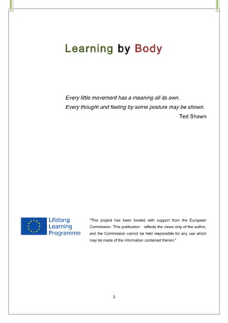 The document outlines a handbook for the 'Learning by Body' partnership project, focusing on the importance of integrating physicality and emotional well-being into adult education through sports and physical activities. It describes various workshops and methods focused on expressive, wellness, and game activities aimed at enhancing personal expression, social integration, and overall health. The project has involved participants from multiple countries, aiming to share best practices and promote the role of physical activities in education.