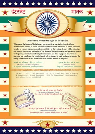 The document outlines India's regime for the right to information, promoting transparency and access to public information, particularly regarding structural steel standards for safety and design. It discusses the Bureau of Indian Standards' publication on structural engineering and the significance of adopting efficient practices to conserve resources in steel production. The handbook provides essential data and guidelines for structural engineers based on Indian standards to facilitate the design and use of various steel products.