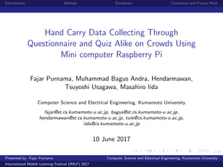 The document presents a method for conducting surveys using a portable server based on the Raspberry Pi, aiming to facilitate data collection in areas with unreliable internet access. It discusses the advantages of this approach, including reduced manual labor and instantaneous statistical results, while also exploring resource usage and stress testing outcomes. The authors conclude that further research is needed for real-world implementation and potential performance improvements.