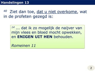 Handelingen 1340 Ziet dan toe, dat u niet overkome, wat in de profeten gezegd is:14 ... dat ik zo mogelijk de naijver van mijn vlees en bloed mocht opwekken, en ENIGEN UIT HEN behouden.Romeinen 112