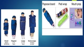 The document discusses the assessment, diagnosis, and treatment of dental issues in handicapped children. It defines a handicapped child as someone who cannot achieve their full potential compared to others due to mental, physical, medical, or social conditions. An initial dental exam is important to establish care and a good relationship with parents. Radiographs can aid diagnosis. The goals of treatment are efficient care with minimal trauma. Restraints may be needed to control movements. Establishing a "dental home" improves preventive care and reduces costs. Home dental care from infancy is advised. Electric toothbrushes and fluoride can aid plaque control. Mentally challenged children often have dental neglect and caries, so maintenance of oral hygiene