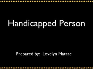 Physical disabilities include blindness, muteness, deafness, loss of limbs, and lack of coordination. Mental disabilities involve difficulties learning, reading, writing, or performing daily tasks independently. When interacting with handicapped persons, one should not mention their disability, allow them to participate in activities they can manage, and let them contribute in areas of strength rather than exempting them from work.