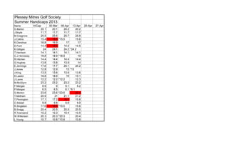 This document lists the names and handicaps of members of the Plessey Mitres Golf Society over 5 dates in spring 2013. It shows each member's starting handicap and any adjustments to their handicap over those dates, with adjustments marked with an asterisk. The purpose is to track members' changing handicaps during the spring season.