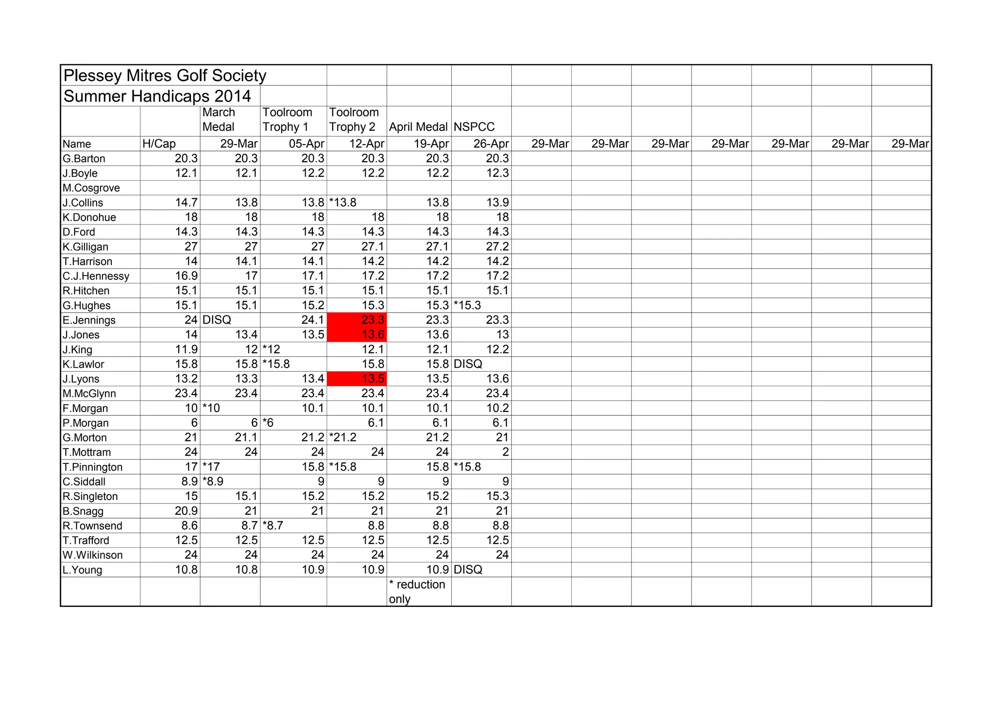 This document contains the handicaps of members of the Plessey Mitres Golf Society for their summer competitions in 2014. It lists each member's name and their handicap for various medal and trophy tournaments held between March and April. Some members' handicaps were reduced based on their scores in previous competitions.