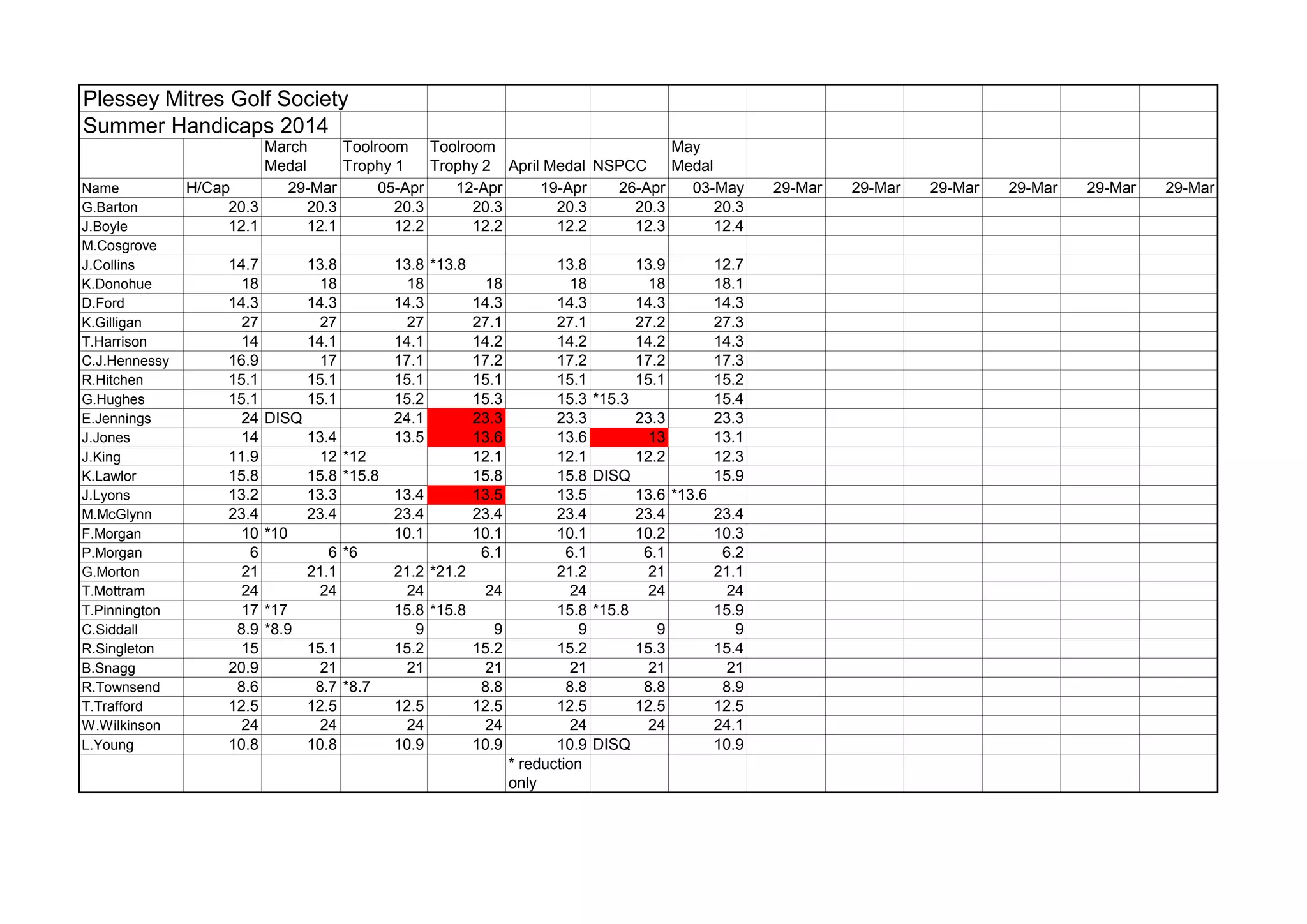 This document contains the summer handicap records for 2014 of members of the Plessey Mitres Golf Society. It lists each member's name and their handicap for various medal and trophy competitions held between March and May 2014. Some members' handicaps were reduced after certain events marked with an asterisk. The document shows each member's monthly progress in improving their golf handicap over the course of the summer season.
