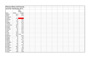 This document lists the summer handicaps for members of the Plessey Mitres Golf Society from March to May 2014. It shows each member's name and their handicap for various medal and trophy competitions held each month. Over this period, most members' handicaps were adjusted slightly up or down based on their performance in competitions.