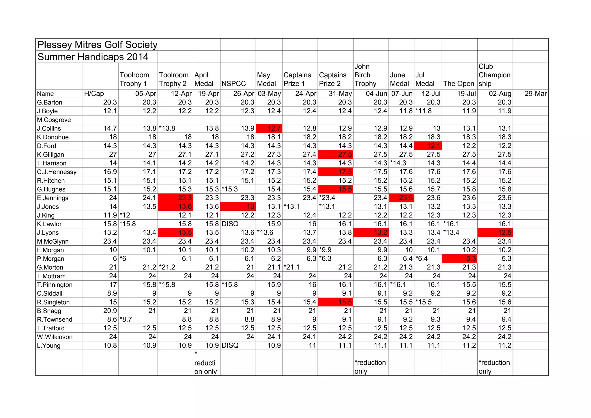 This document lists the summer handicaps for members of the Plessey Mitres Golf Society in 2014. It shows each member's name, starting handicap, and how their handicap changed after each competition between April and August. Some competitions included trophies or prizes for different categories. Asterisks next to dates indicate only reductions in handicaps occurred on those dates.