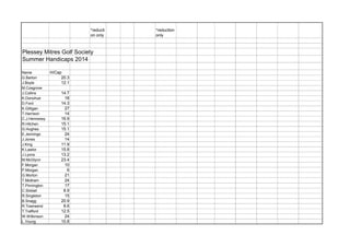 The document appears to be a record of handicaps for members of the Plessey Mitres Golf Society over the summer season of 2014. It lists the names and starting handicaps of 27 golfers, along with their handicaps after each of 23 different golf tournaments and matches between March and September 2014. Some golfers' handicaps increased or decreased slightly while others remained the same. The document serves to track individual handicap adjustments throughout the summer season.