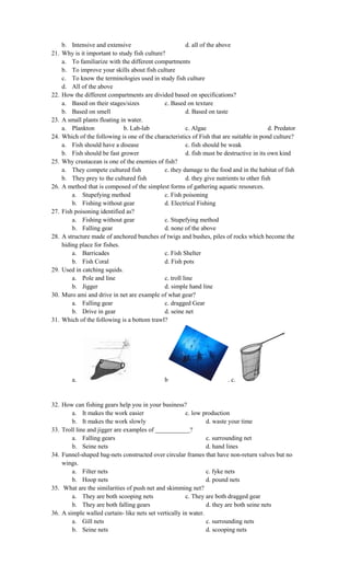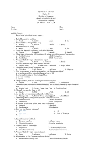 This document contains a 50 question multiple choice test on topics related to fish and fisheries such as fish anatomy, fish culture, fish capture, and fish preservation. The test was administered at Gutad National High School in Floridablanca, Pampanga, Philippines. It covers terminology, concepts, and processes involved in studying the structure of fish, fish culture methods, different fishing gears, and ways of controlling fish spoilage including drying, canning, salting and pickling. The document provides the questions asked on the test but does not include the answers.