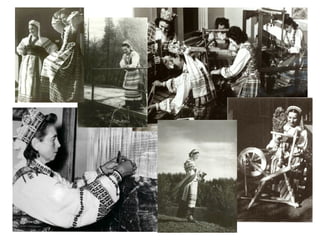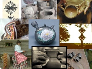 Weaving, black pottery, and cross crafting are three important handicrafts in Lithuanian folk art. Weaving was used to create bedspreads, costumes, and woven items that reflected a person's mentality. Black pottery from the 18th century Dzūkija region is black-colored and durable like metal. Lithuanian cross crafting combines elements of architecture, sculpture, and painting in crosses that feature symbols of the sun, birds, and the tree of life, and was recognized by UNESCO in 2001.