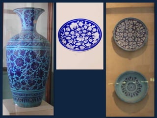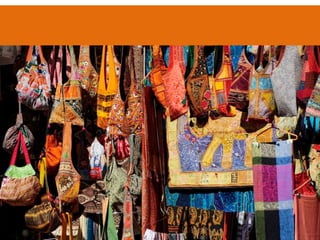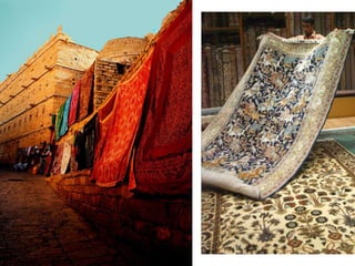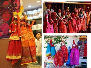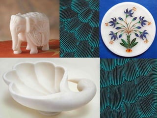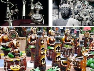This document provides information on several traditional Indian art forms, including the use of blue glaze in pottery, Bagru block printing using wooden blocks, hand-knotted carpets and cotton durries with Persian and geographical designs, ancient puppet folk entertainment, sculptures, jutis engraved with embroidery, marble craft, and miniature painting.
