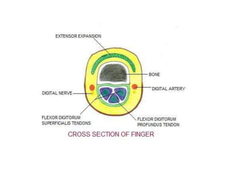 The hand is important for communication, sensation, employment, and independent living. It has complex anatomy with small areas and many structures that can be injured. Common hand injuries include fractures, lacerations, amputations, infections, and bites. Assessing injured hands involves examining for deformities, feeling for sensation and temperature changes, and looking for signs of specific injuries. Many injuries require splinting or surgery followed by hand therapy for recovery. Injuries can have long term functional consequences if not properly treated.