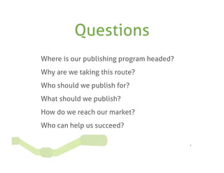 This document outlines a publishing company's strategy for marketing and promoting authors and books. It discusses researching consumer trends, developing a publishing strategy, managing backlists of existing books, using digital and traditional marketing, leveraging author platforms, and providing author services like social media support and content creation. Partnerships and data analysis will help reach the target market through advertising, events, and leveraging communities. The goal is to engage readers and fans through original content, social media, and ancillary products while promoting new titles and maintaining backlists. A team of marketing and publishing experts will help execute this strategy.