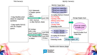 Документ описывает Handlersocket, MySQL плагин для низкоуровневого доступа к данным в InnoDB/XtraDB, а также его возможности, плюсы и минусы. Он обеспечивает высокую скорость обработки запросов, поддерживает пакетную обработку и совместим с репликацией, но имеет ограничения, такие как отсутствие транзакций и неполную поддержку базовых функций MySQL. В документе также приводятся примеры использования Handlersocket в различных сценариях и даются рекомендации по его настройке и применению.
