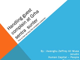 Dokumen ini membahas cara menangani keluhan tamu di Grha Sentra Sunter, baik dari pihak eksternal maupun internal. Berbagai jenis keluhan dijelaskan, seperti ketidakpuasan terhadap fasilitas dan perlakuan tidak ramah, beserta cara-cara efektif untuk menghadapinya, termasuk mendengarkan, memahami, dan menawarkan solusi. Dokumentasi juga menekankan pentingnya tetap tenang, mengambil semua keluhan dengan serius, dan melakukan follow-up setelah penyelesaian masalah.