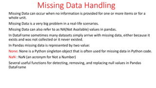 This document discusses the handling of missing data in pandas, explaining how to identify, fill, and remove missing values using various functions like isnull(), fillna(), and dropna(). It also covers reshaping dataframes, merging dataframes, and basic plotting techniques with matplotlib, providing examples for each method. Overall, it serves as a comprehensive guide for managing data and visualizations in Python's pandas library.